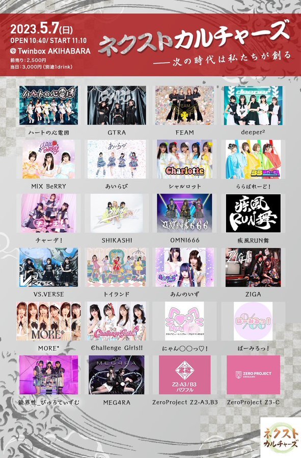 5/7(日)『ネクストカルチャーズ』 SCHEDULE 2023/05/07(日) 13:10 - 13:30 Twinbox AKIHABRA 地図を表示 【時間】 開場 10:40/開演 11:10 LIVE 13:10-13:30 特典会 14:15-15:15 【会場】 Twinbox AKIHABRA 【料金】 前売り¥2,500-/当日¥3,000- チケットはこちら URLをコピーする 報告する