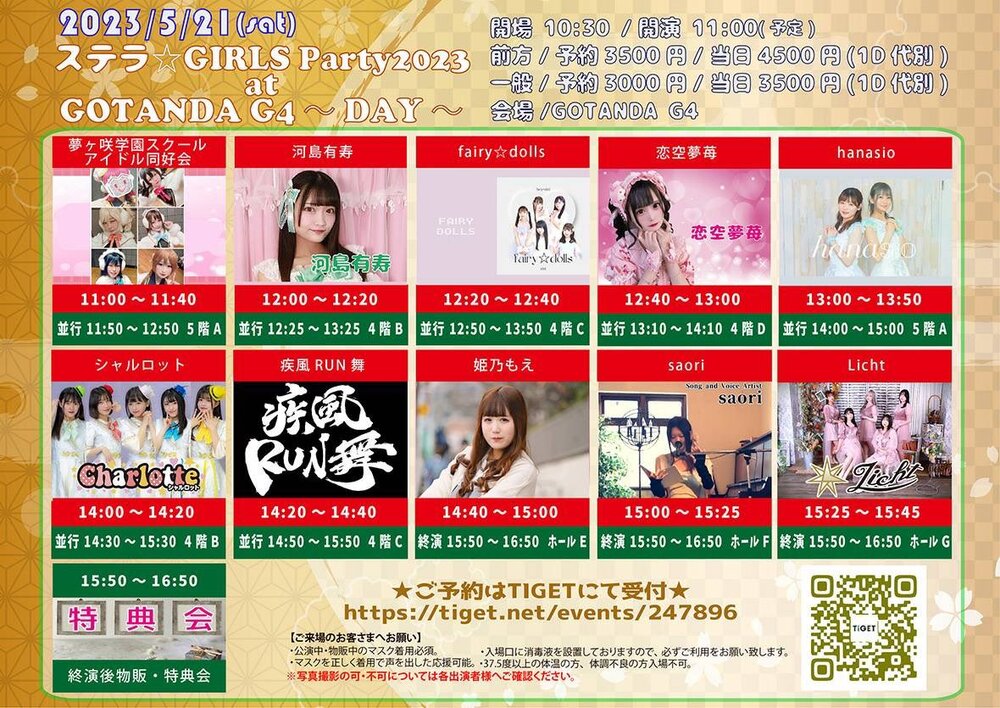 5/21(土)『ステラ☆GIRLS Party2023atGOTANDA G4 ~DAY~』 SCHEDULE 2023/05/21(日) GOTANDA G4 地図を表示 【時間】 Open 10:30/Start 11:00(予定) 【会場】 GOTANDA G4 【料金】 5/15(月)21:00〜 前方/予約3500円/当日4500円(1D代別) 一般/予約3000円/当日3500円(1D代別) ★声出しOK!(マスク着用) チケットはこちら URLをコピーする 報告する