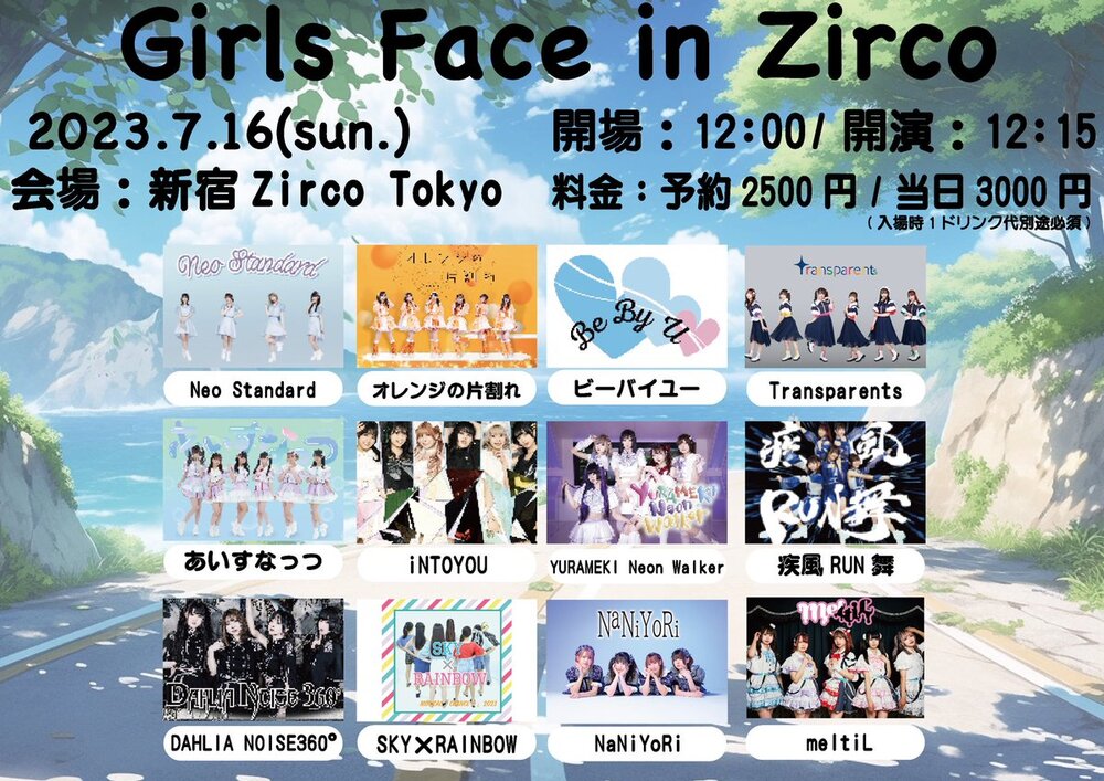 7/16(日)『Girls Face in Zirco』 SCHEDULE 2023/07/16(日) 17:10 - 17:35 新宿Zirco Tokyo 地図を表示 【時間】 開場12:00/開演12:15 LIVE 17:10-17:35 特典会 18:10-19:10 【会場】 新宿Zirco Tokyo 【料金】 予約2500円 当日3000円 (入場時1ドリンク必須) ※7/11(火)22:00~予約開始 チケットはこちら URLをコピーする 報告する