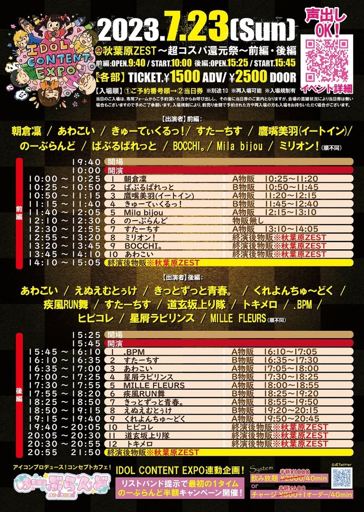 7/23(日)『 IDOL CONTENT EXPO @秋葉原ZEST ~超コスパ還元祭~後編 』 SCHEDULE 2023/07/23(日) 17:55 - 18:20 秋葉原ZEST 地図を表示 【時間】 開場15:25/開演15:45 LIVE 17:55-18:20 特典会 18:25-19:20 【会場】 秋葉原ZEST 【料金】 前売1500円/当日2500円 ※別途1D ※再入場可能 ※入場規制有 チケットはこちら URLをコピーする 報告する