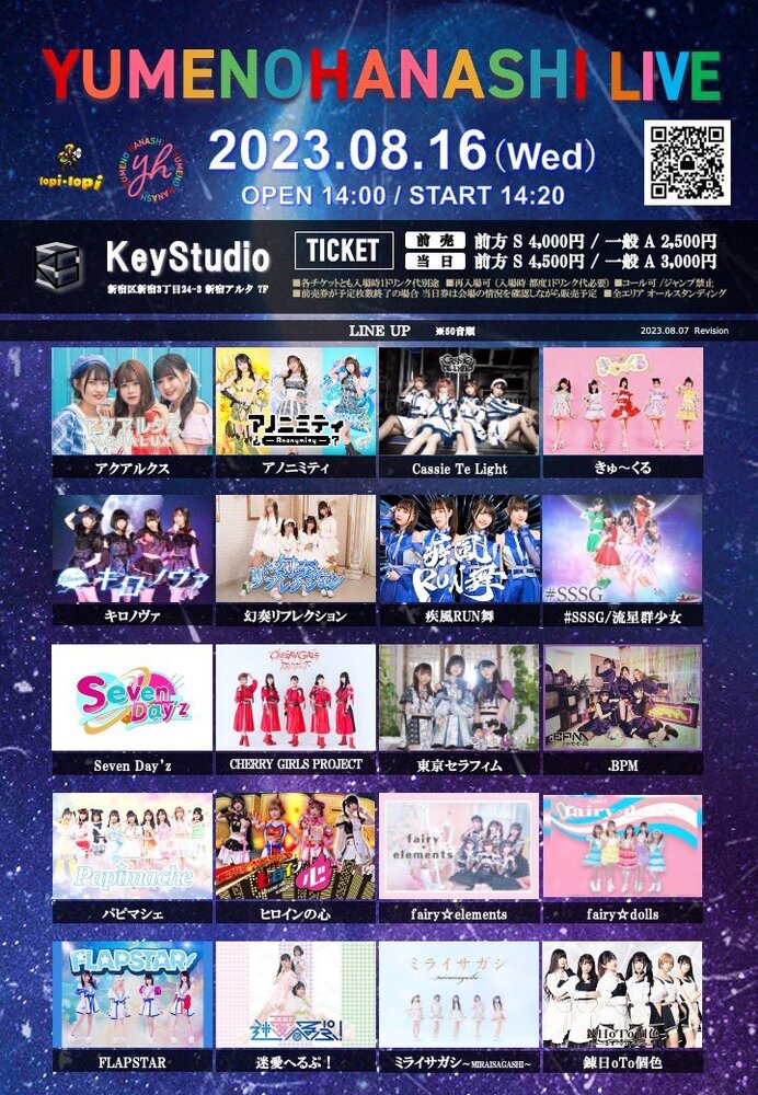 8/16(水)『YUMENOHANASHI LIVE』 SCHEDULE 2023/08/16(水) 19:20 - 19:40 KeyStudio 地図を表示 【時間】 OPEN14:00/START14:20 LIVE 19:20-19:40 特典会 19:45-20:45 【会場】 KeyStudio 【料金】 前売前方¥4000/ 一般¥2500(当日+¥500) ※各チケット別途1ドリンク代必要 ※再入場可能(再入場の際 都度ドリンク代必要) チケットはこちら URLをコピーする 報告する