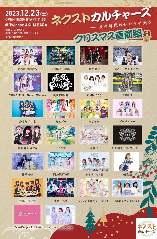 12/23(土)『ネクストカルチャーズ-クリスマス直前編-』 SCHEDULE 2023/12/23(土) 18:50 - 19:10 Twinbox AKIHABRA 地図を表示 【時間】 開演 11:00予定 LIVE 18:50-19:10 特典会 20:05-21:05 【会場】 Twinbox AKIHABRA 【料金】 前売り¥2,500-/当日¥3,000- チケットはこちら URLをコピーする 報告する