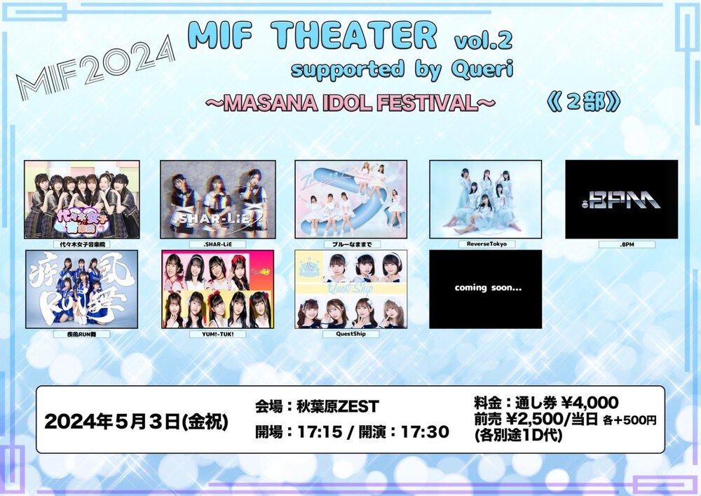 5/3(金祝)『MIF THEATER Vol.2』 SCHEDULE 2024/05/03(金) 秋葉原ZEST 地図を表示 【時間】 ▼2部 OPEN 17:15/START 17:30 【会場】 秋葉原ZEST 【料金】 4/17 19:00〜 前売 2500円/当日 3000円(D別) チケットはこちら URLをコピーする 報告する